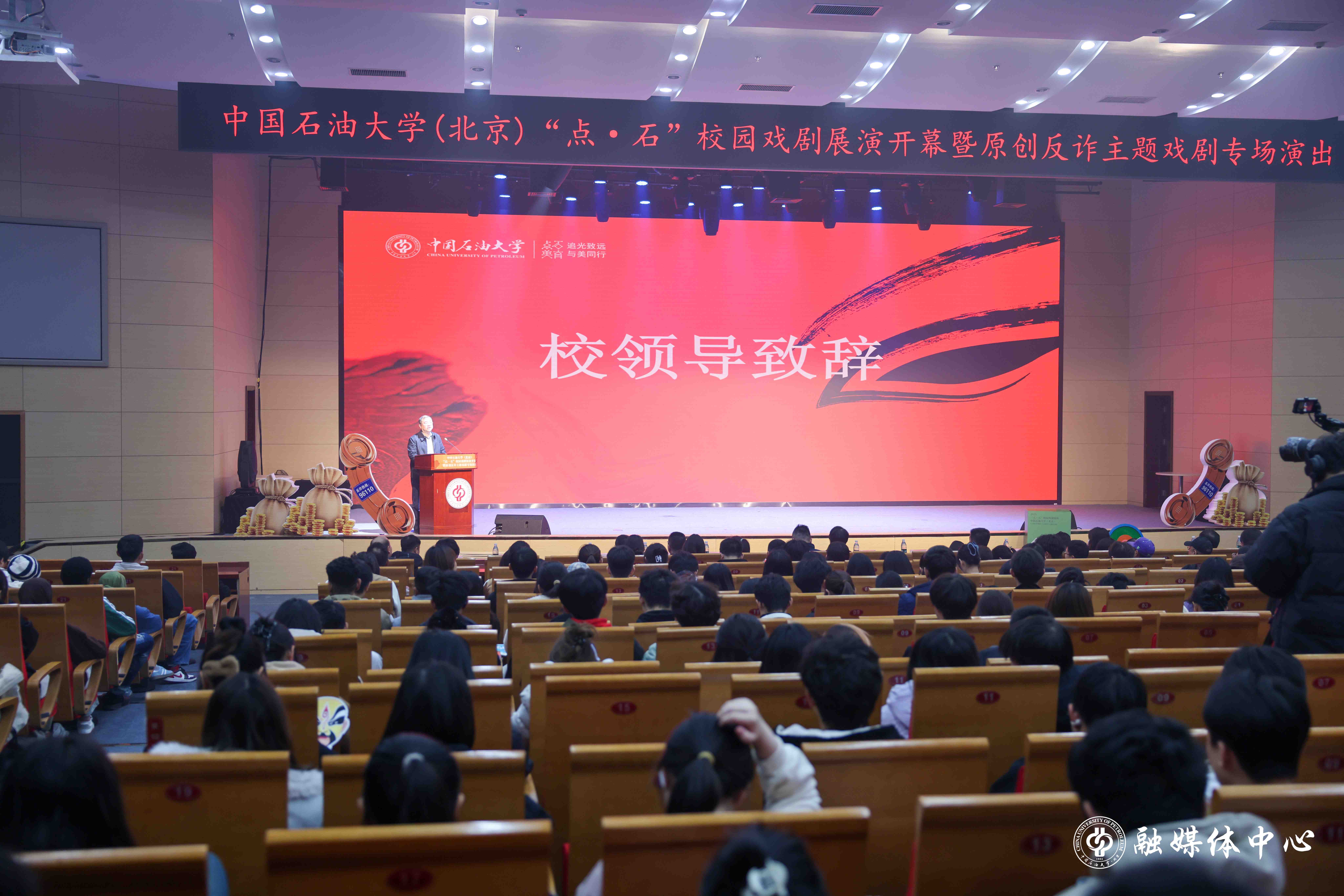 11月12日晚,beat365“点·石”校园戏剧展演开幕式在中油大厦三层报告厅举行。本次活动以“青春有戏,向美而行”为主题,旨在通过戏剧艺术形式深化美育育人功能,全方位地将美育与德育、智育、体育、劳育有机融合,构建具有beat365特色的校园文化育人平台。学校党委常委、副校长黄磊,北京市公安局昌平分局、昌平区反诈中心、松园派出所、昌平区文联等相关单位负责人,以及驻昌高校代表、学校相关职能部门和学院负责人出席活动。