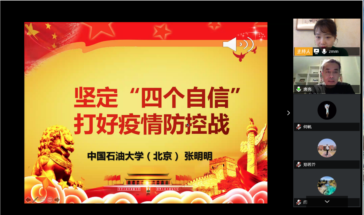 张明明教授先从“四个自信”的内涵、意义入手,从中国道路的纵向和横向比较讲明何为道路自信,从理论制度不自信的反面案例说明何为理论自信,从第三波民主化浪潮和不搬政治制度上的“飞来峰”阐明何为制度自信,从文化和传统、“马”“中”“西”争论说明何为文化自信。将“四个自信”贯穿在疫情学习的始末,内容详实,深入简出,从疫情和舆论的关系、疫情中出现问题反思出发,就如何在疫情发展的过程中,坚定“四个自信”,增强打好疫情防控站的信心展开研讨。