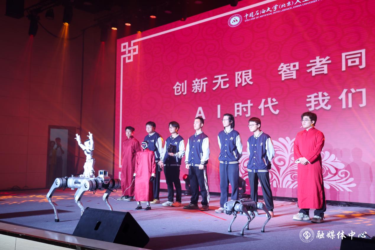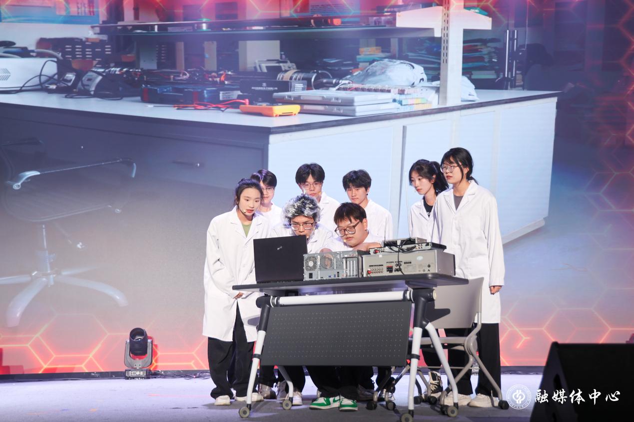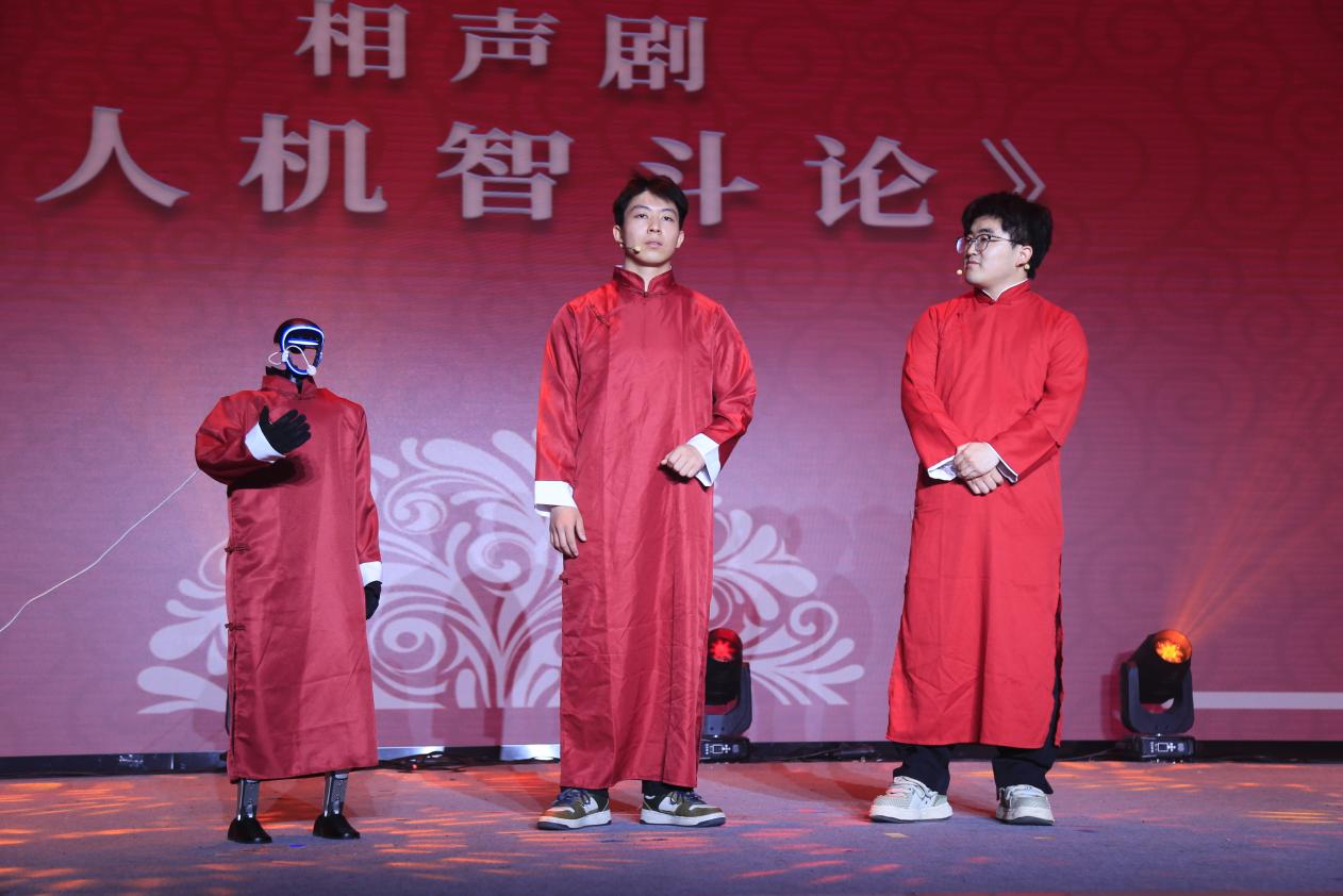 “敬不凡”篇章中,情景剧《地心密钥》通过情景剧、数据可视化与装置模型演绎,展现青年科研团队突破万米深地极限的壮举。相声剧《人机智斗论》,以一台人工智能学院自主编程的人形机器人(具身智能)为核心,展现AI的思考力、大模型的可进化力、具身智能的互动力,同时让具身智能小菜在幽默中担当教育者的角色,弘扬主流价值观。