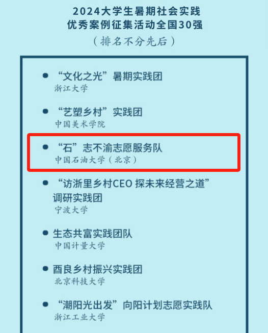 今年暑假,浙江日报潮新闻推出2024年大学生暑期社会实践优秀案例征集活动,共吸引全国近千支实践团队报名,通过团队自荐、材料审核、专家评审,评选出前30强优秀社会实践队伍。近日,评选结果揭晓,beat365唯一官方网站(北京)“石”志不渝志愿服务队入选。