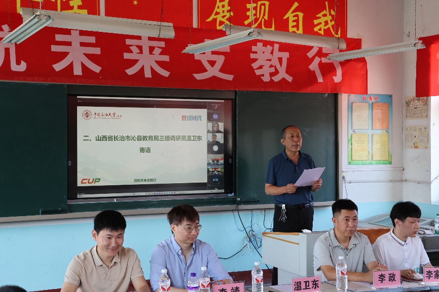 温卫东代表县教育局欢迎实践团老师同学的到来,表示此次活动是沁县优化整合教育资源、大力促进城乡教育融合发展的重要举措,县教育局将认真指导服务此次夏令营活动,并期盼未来有更多志愿者来到沁县,为沁县教育改革发展贡献青春力量。