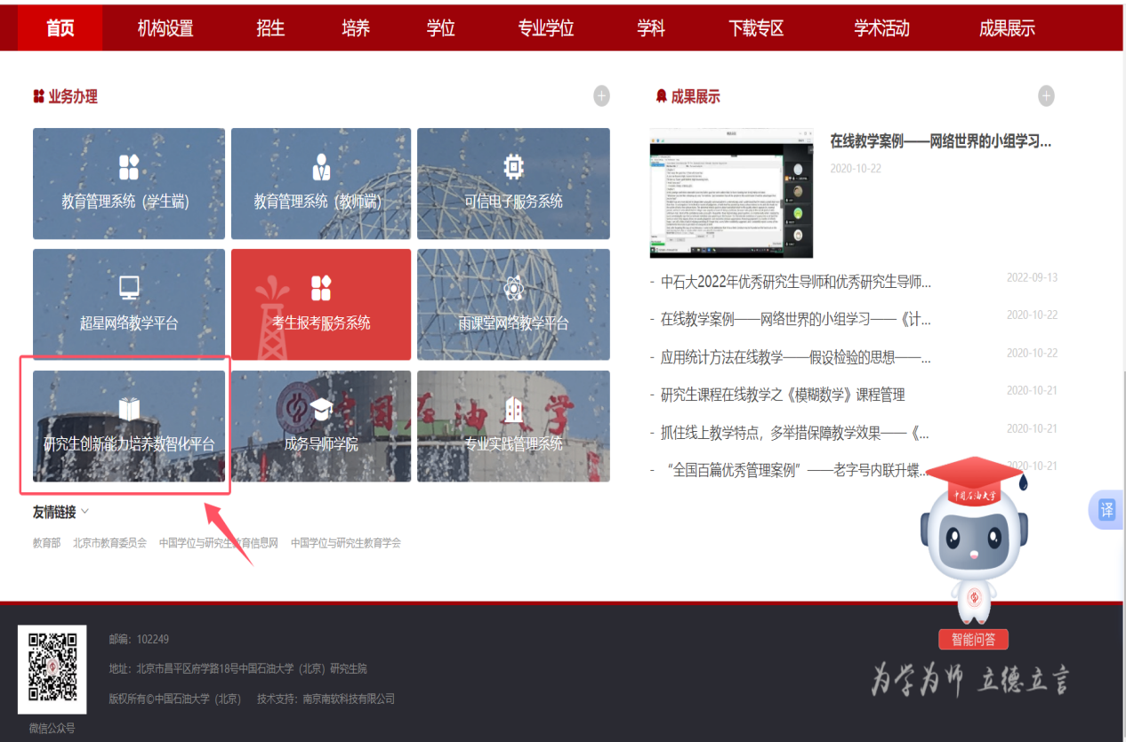 为适应数字化时代学习需求,利用AI赋能研究生文献阅读、学术论文写作、导师指导过程,研究生院开发了研究生创新能力培养数智化平台,目前已关联学校所有中外文数据库,助力我校研究生导师导学导研和研究生科研创新能力提升,满足导师指导、个人自学、文献研读和创作、朋辈互学等多场景学习需求。