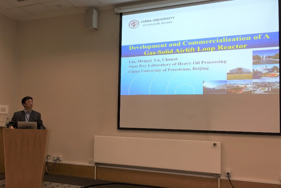 此外,石大化学工程与环境学院的刘梦溪教授应邀做了题为“Development and Commercialization of a Gas-solid Airlift Loop Reactor”的主题报告,深入介绍了石油大学专利技术气固环流反应器在基础研究和工业应用方面的最新进展。气固环流反应器是将气液环流理论创新性地拓展到气固体系而获得的一种高效气固反应器,通过在反应器内构建有序、可控的气固环流流动,极大地强化了气固两相间的质量传递和热量传递。多年来,刘梦溪教授、卢春喜教授等围绕气固两相的宏观流动、介尺度流动和相间传递展开了大量基础研究,巧妙利用气固环流流动,开发出了组合汽提器(MSCS)、催化剂取热器、催化剂混合器等催化裂化关键装备,并在近20套装置实现工业化应用,累计为企业创汇40.6亿元,并获得1项国家奖和2项省部级奖励。由于效果显著,该成果获得到场国际同行的一致好评。
