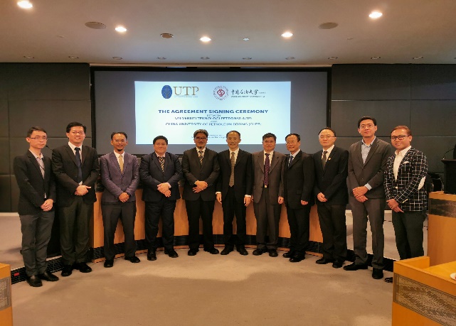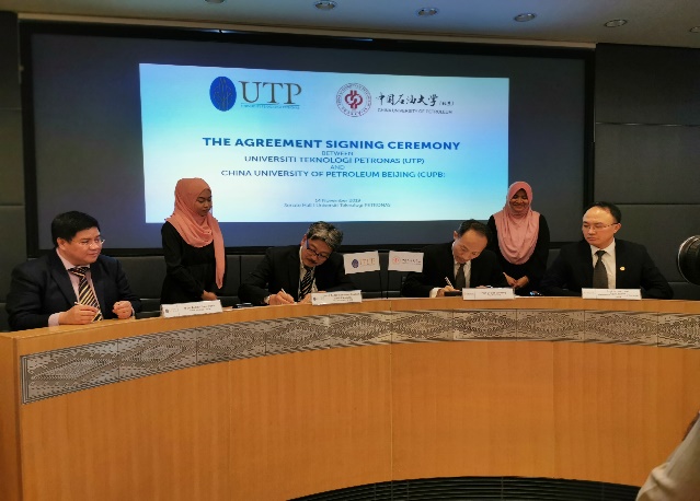 马来西亚国油大学UTP(Universiti Teknologi Petronas)成立于1997年,是马来西亚国家石油和天然气公司PETRONAS的全资私立大学。校园位于马来西亚Perak Darul Ridzuan的Bandar Seri Iskandar,地理位置优越。UTP在本科和研究生阶段提供广泛的与行业相关的工程,科学和技术课程。该大学与PETRONAS以及本地和国外的其他机构和行业合作开展了广泛的研究活动,涉及六个研究重点和关键领域,分别是:石油工程,自我可持续建筑,运输基础设施,健康分析,碳氢化合物回收,污染物管理和自动系统。鲍志东分别与马来西亚国油大学副校长Mohamed Ibrahim A Mutalib教授,就两校在科研合作、学生互换,教师互访,短期授课、暑期学校进行讨论,就双方成为首批“世界能源大学联盟”成员,进行平台共建等问题进行深入交谈。会谈之间马来西亚国油大学签署联合实验室合作协议。鲍志东邀请Mohamed Ibrahim A Mutalib 参加由石大举办的“全球能源奖峰会2020”以及“世界能源大学联盟秘书处会议”, Mohamed Ibrahim A Mutalib愉快接收了邀请。