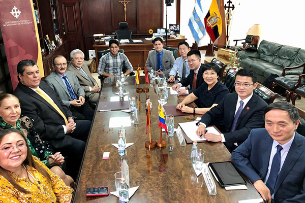 在厄瓜多尔基多圣弗朗西斯科大学,山红红一行会见了该校校长Santiago Gangotena及两校共建孔子学院中外方院长,召开了2019年孔子学院理事会会议。会议总结分析了孔子学院发展取得的成绩和存在的问题,并就下一步改进方向达成了共识。会后,山红红一行看望了孔子学院汉语教师。