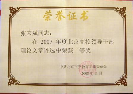 近日,由北京市委教育工委主办的“2007年度北京高校领导干部理论文章评选活动”评选结果揭晓,我校张来斌校长撰写的文章《新质量观:步入大众化时代的高等教育》荣获二等奖。