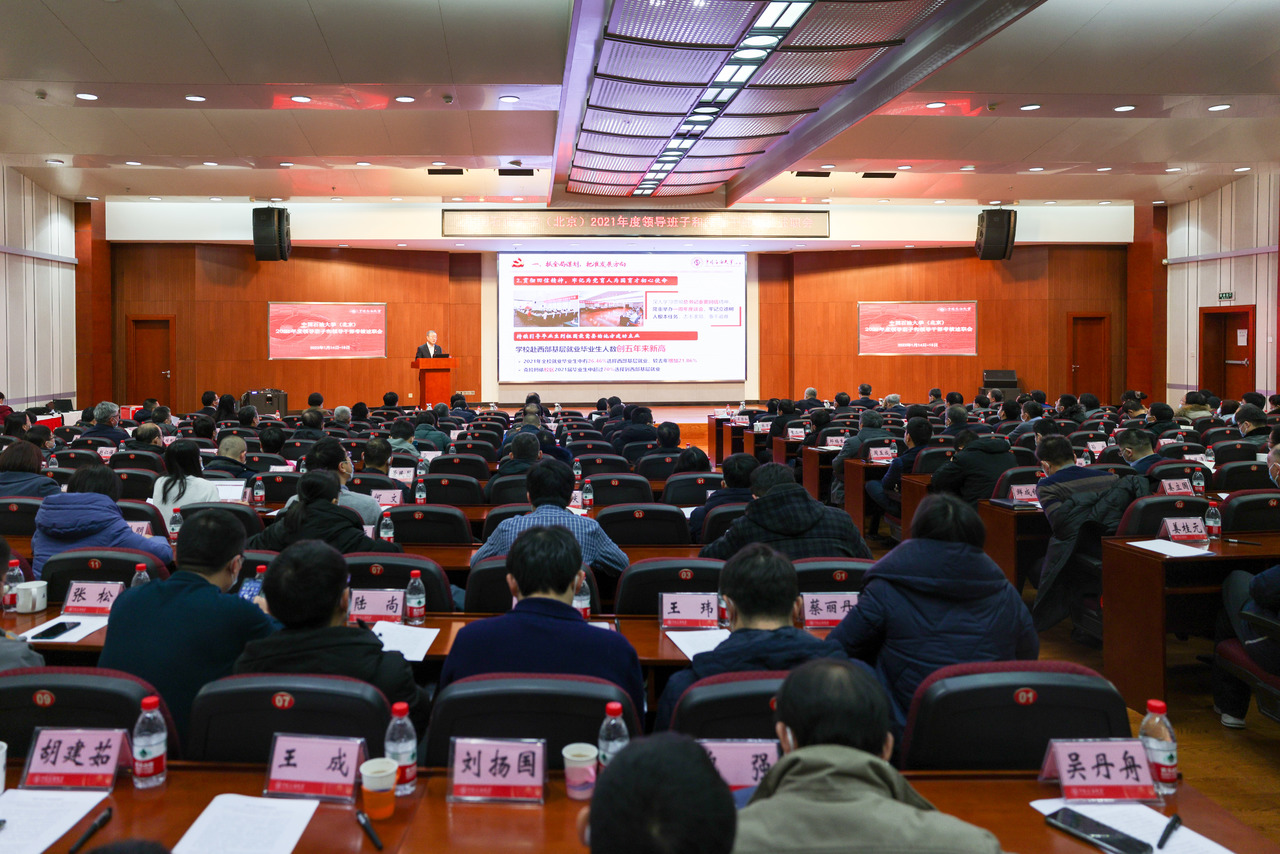 党委书记陈峰全面总结了2021年学校重点工作,专题报告了2021年学校选人用人工作情况,详细通报了学校领导班子党史学习教育专题民主生活会情况。他指出,2021年是学校改革发展历程中极具挑战、极不平凡的一年,学校党委把方向、管大局、作决策、抓班子、带队伍、保落实,引领“十四五”稳健开局。一是抓全局谋划,把准发展方向。持续贯彻习近平总书记回信精神,不断提升办学治校水平和立德树人成效;扎实推进党史学习教育,教育引导广大党员干部和师生员工学史明理、学史增信、学史崇德、学史力行,不断从党的百年非凡历程中汲取奋进力量;锚定“双碳”目标和能源安全战略,制定“十四五”发展规划;全力以赴加快建设克拉玛依校区,坚决扛起疫情防控和定点帮扶政治责任。二是抓党建引领,突出全面深入。深入贯彻《中国共产党普通高等学校基层组织工作条例》,持续打好党的政治建设攻坚战,推动全面从严治党向纵深发展;深入推进基层党组织“对标争先”建设,初步形成“一院一品”生动局面;大力加强干部队伍建设,顺利完成干部集中换届工作,从严从实加强干部管理监督,着力锻造高素质干部队伍。三是抓改革攻坚,聚焦重点难点。召开学校思想政治工作会议,完善纵向贯通横向联动的思想政治工作体系,推动德智体美劳全面培养的贯通式大教育体系改革,统筹抓好教育评价改革任务落地实施,推进国家重点实验室改革重组,积极争取拓展办学资源,推动校属企业体制改革和后勤综合改革,扎实开展“民生重点工程”。